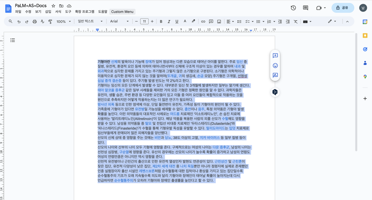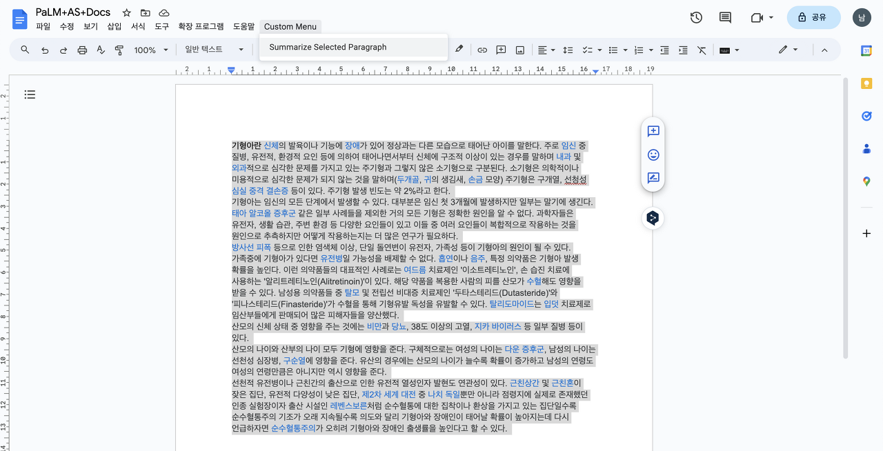 기형아에 대한 글을 넣고, 글을 선택한 다음 새롭게 생긴 메뉴 Custom Menu를 클릭하면 Summarize Selected Paragraph를 만날 수 있습니다.